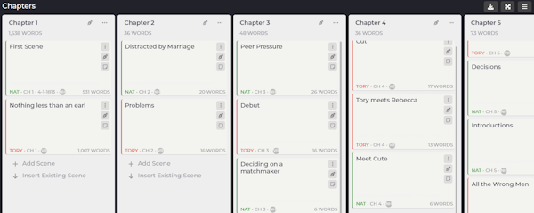 The way it’s organized is quite nice: You have a column with a list of your scenes, a column that is where you do your writing, and then a column where you can put in notes and tag the scene with characters, setting, object, or plot. For each of these tags, you can go into much more detail choosing a template with default attributes or you can create your own. (It is in the character tags that you can get into the weeds of each major (or minor) character. (Oddly, it doesn’t have goal/motivation/conflict as a pre-set list, which, of course, is the one I use.)