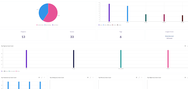 You can’t quite see it because I had to make this really small, but from left to right: published words & world building; popular words; the number of chapters, scenes, and tags; top tags by scene count; top characters by scene count; and then the same for settings, plots and objects.