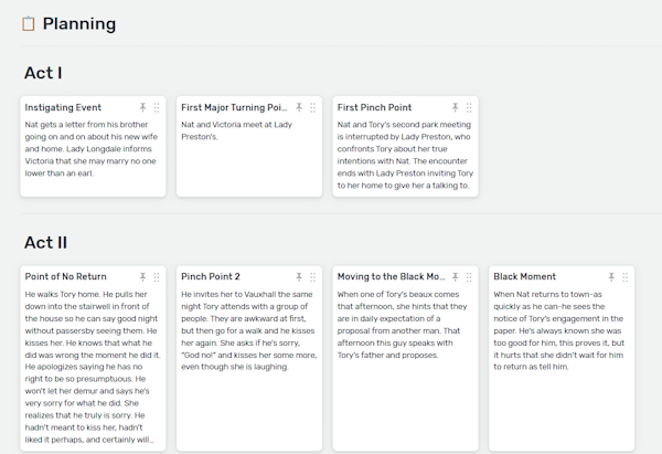 In addition to the writing space, there are also “boards” that you can create. These are merely blank spaces that you can fill with whatever you want. I created one for characters and another for my plot outline. You create “folders” and then cards within each folder. Here’s an example of my plot board: