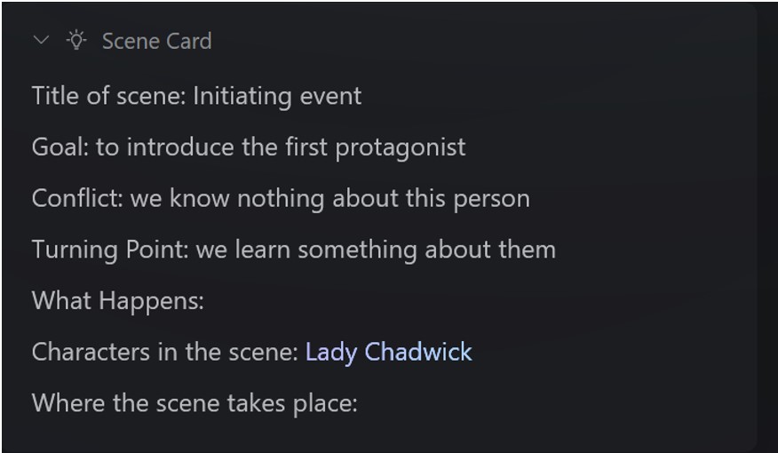 The problem is when I tried to paste in that scene card into my document (I’m writing this in Kortex) just now, all I got was a blank box that had the heading at the top. I had to copy and past in all the information you see there. Template? Na-ah. Am I doing something wrong? Perhaps, but goodness only knows what!